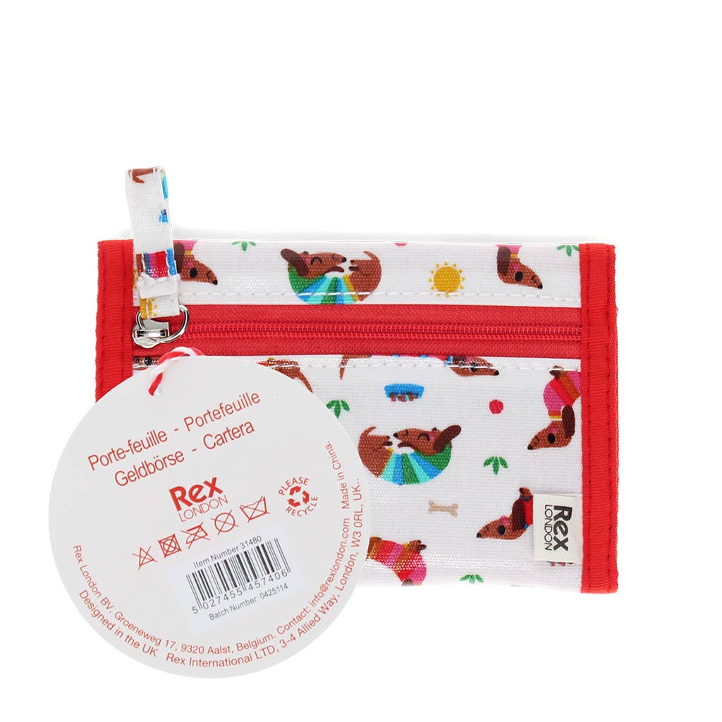 Children's tri-fold wallet in white and red, adorned with sweet sausage dogs out in the sunshine.