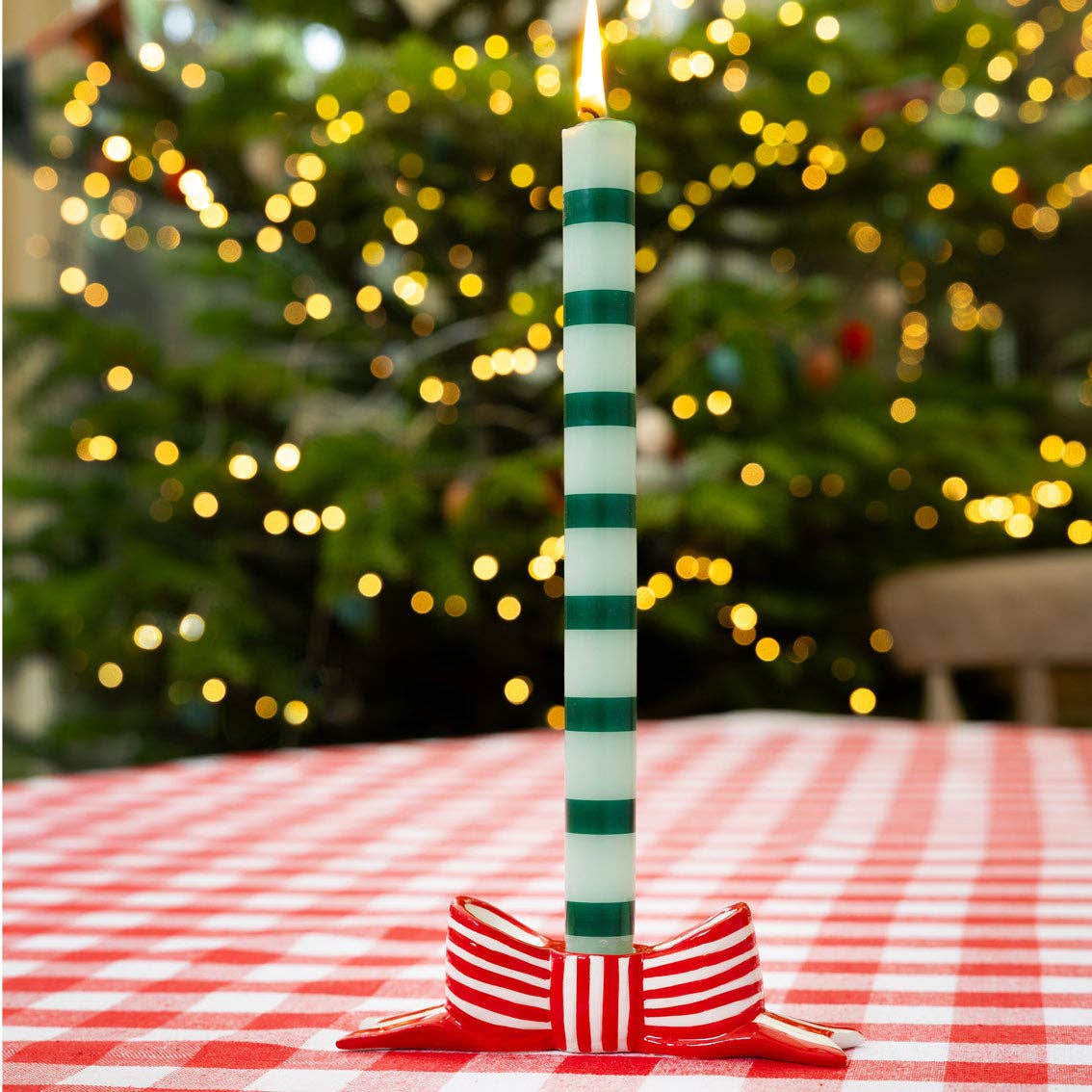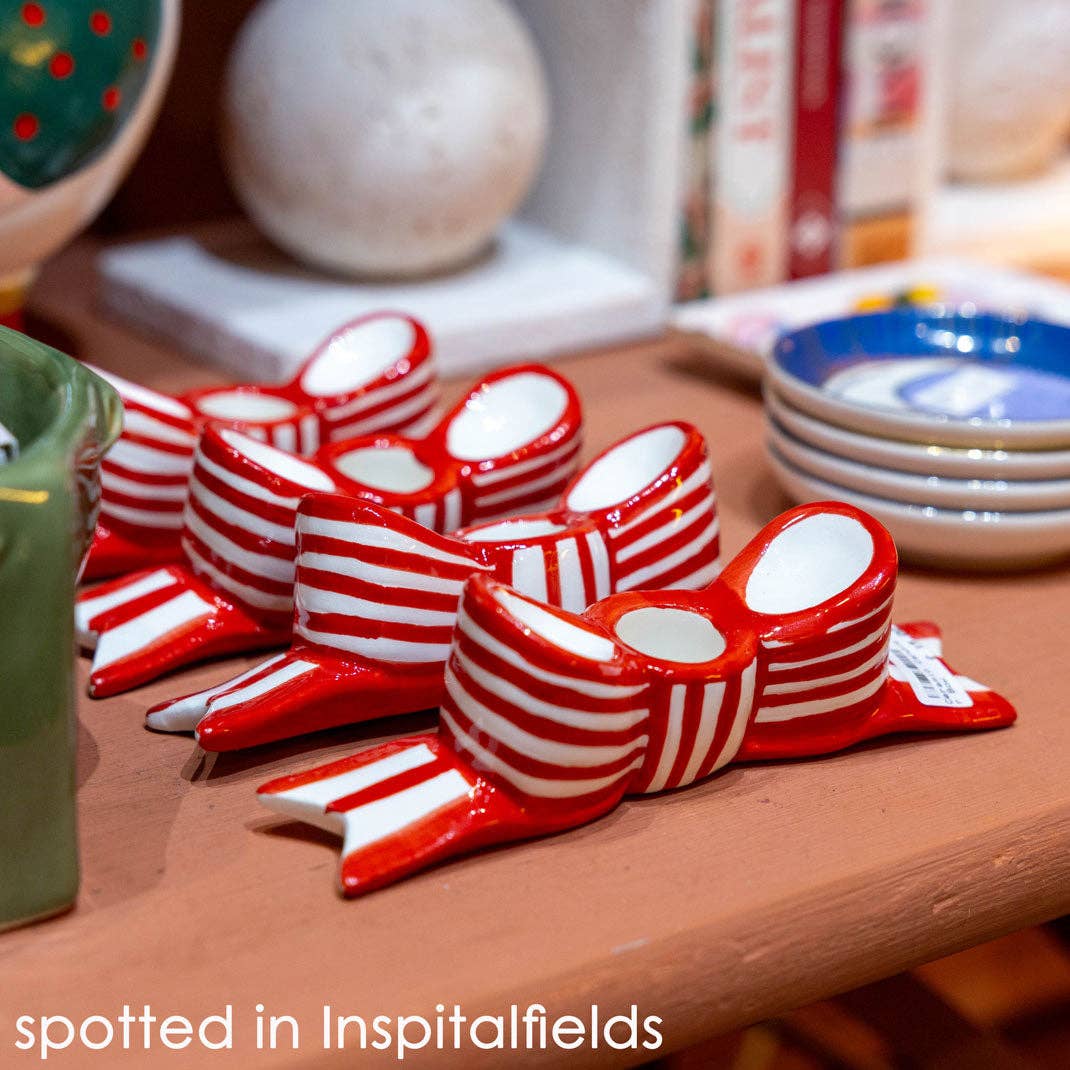 Add a charming twist to your table decor with this hand painted Bow Ceramic Candle Holder. Featuring a sculptural ceramic bow shape in a striped finish, this elegant holder brings a touch of playful sophistication to any tablescape or mantle. Designed to fit a standard dinner candle, it’s both functional and decorative.
