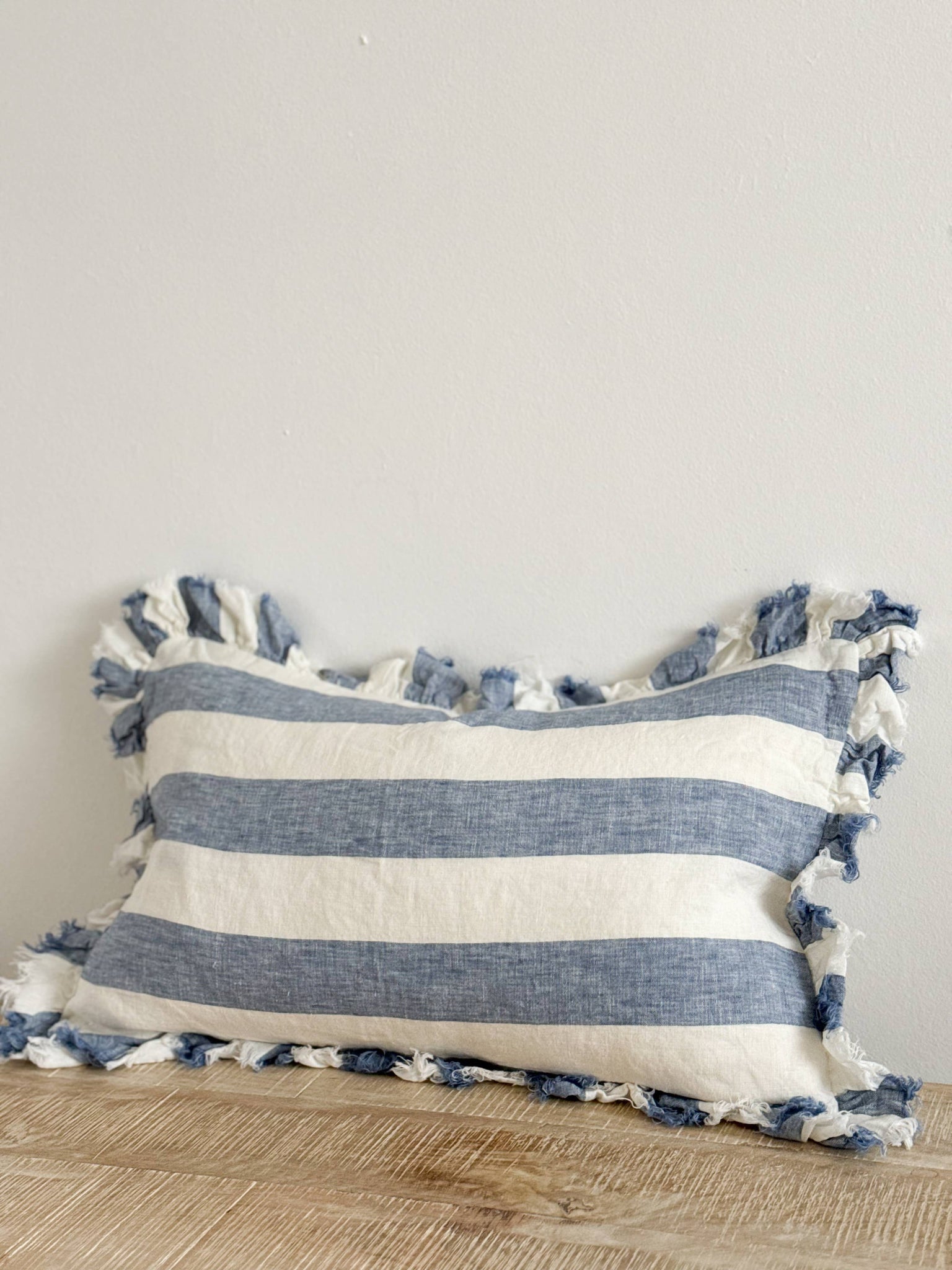 Cushion cover only Material: 100% stonewashed linen Size: 50x30cm & 45x45cm Wash Instructions: Machine Wash Individually Colour: Blue Wide Stripe Ruffled edge 1/3 opening at the back