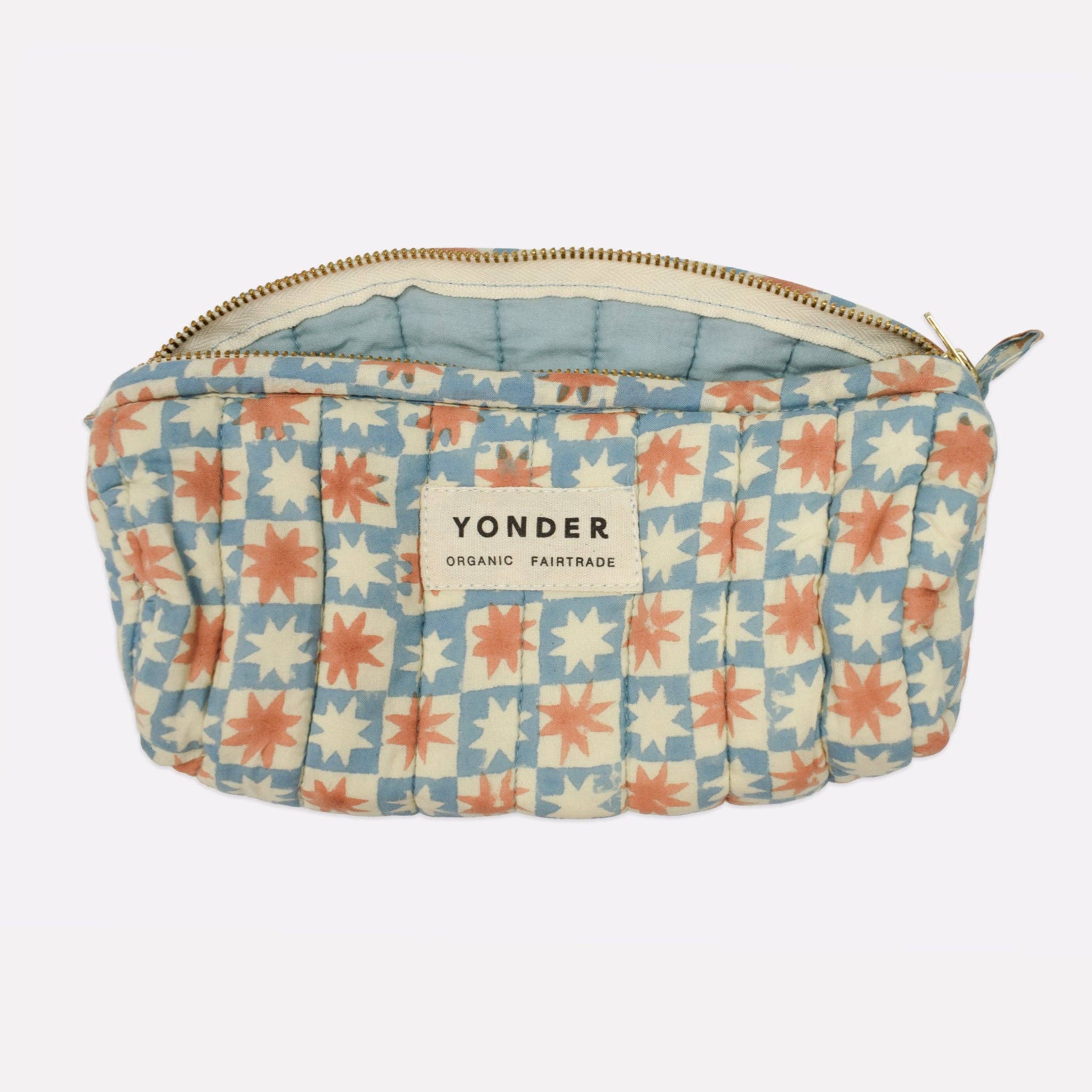 This playful Quilted Barrel Case in soft sky blue is hand-printed with stars on organic cotton. Use it as a purse, makeup bag, or pencil case to keep your essentials stylishly organised with a fun, starry twist.
