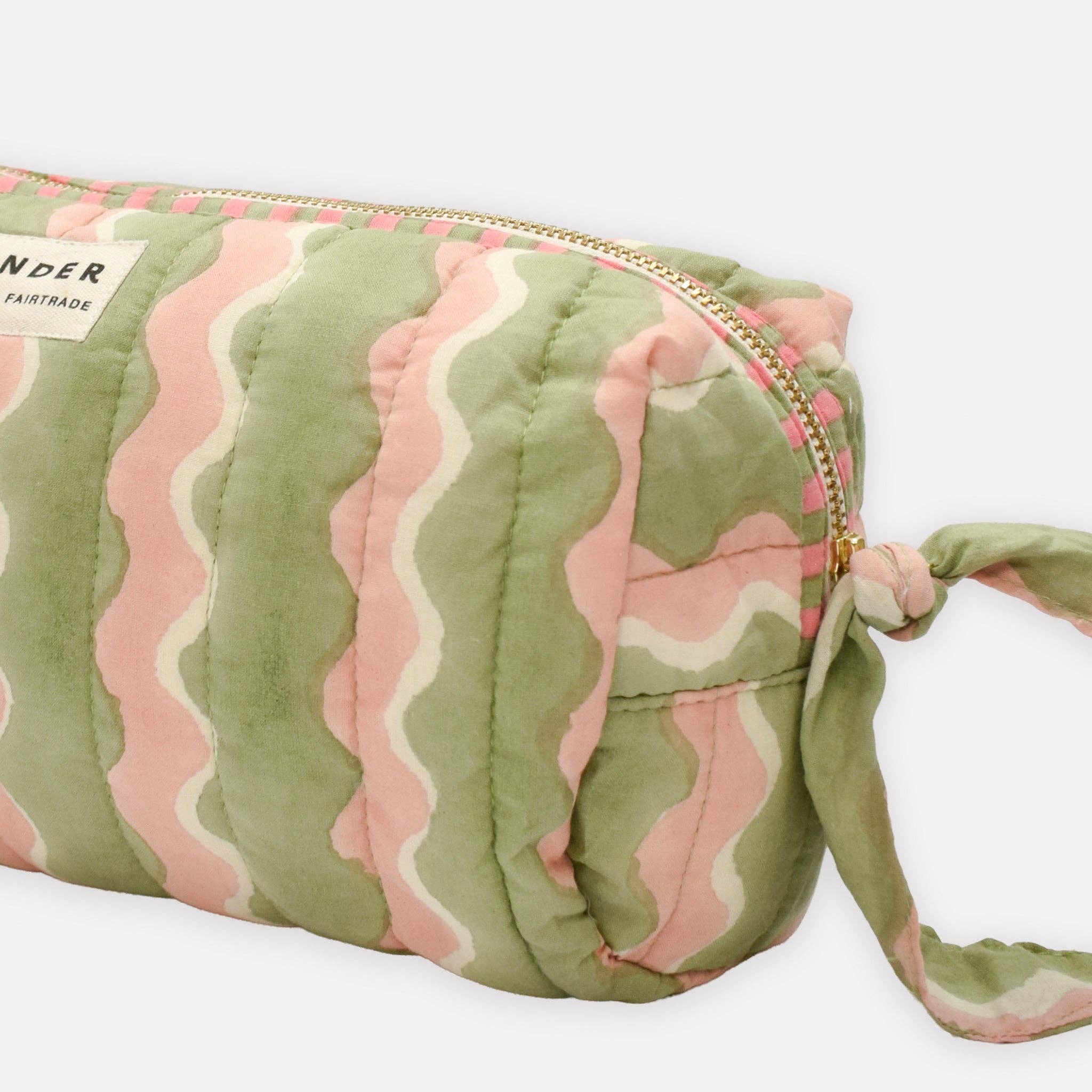 Handmade in Jaipur from soft organic cotton, this wash bag pairs sage green with gentle blush waves for a calm, balanced look. The light quilting gives it a soft yet sturdy feel, making it ideal for everyday use or travel. It fits all your essentials — skincare, toiletries, or makeup — while staying light and easy to pack. Dyed with eco-friendly, AZO-free pigments and crafted with care, it’s a thoughtful piece made to last.
