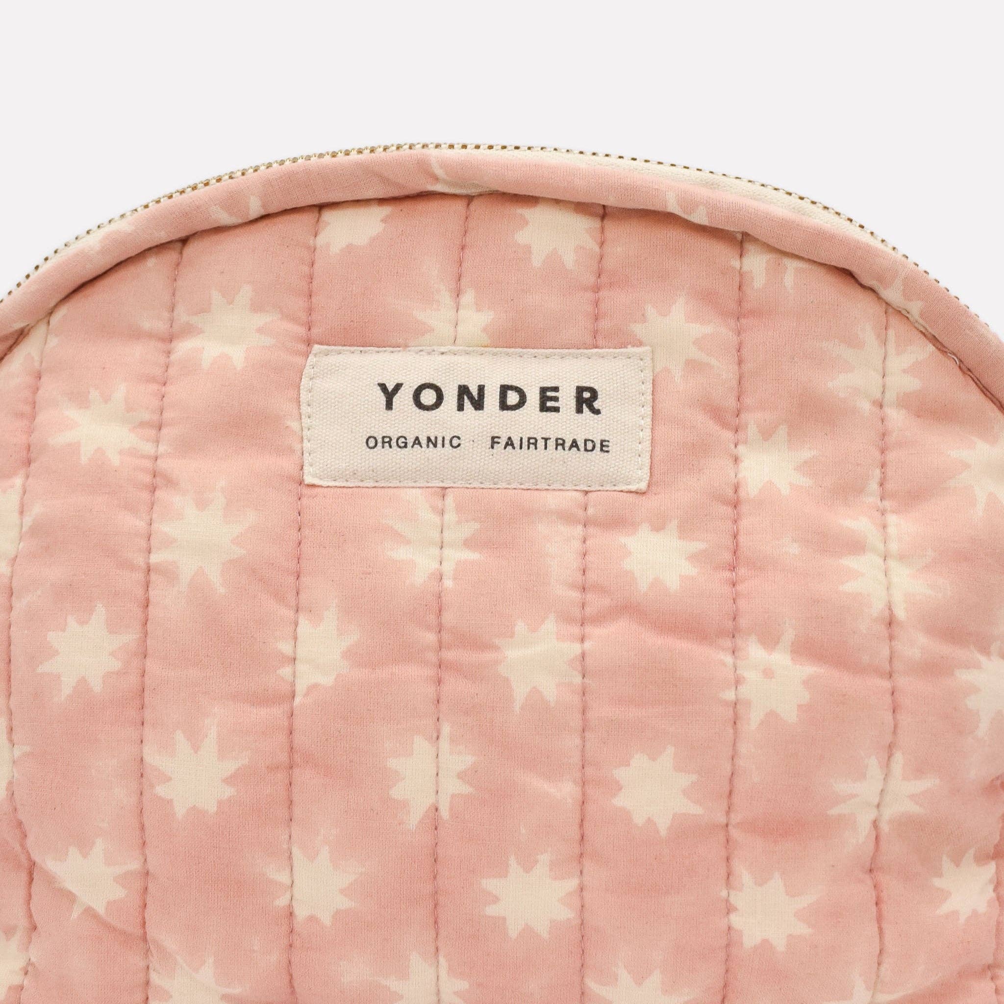 This charming quilted zip pouch is perfect for storing your daily treasures. Crafted from organic cotton and hand block-printed in Jaipur, it showcases a whimsical “cosmic” star pattern in cozy ginger tones with creamy highlights. Sized just right for makeup, travel must-haves, or tiny mementos, it’s topped off with a fabric zip pull and Yonder’s signature fairtrade label. Light yet cushioned, it’s both delightful and practical for everyday adventures. * 100% organic cotton * Hand block-printed in Jaipur * Quilted for a soft, padded feel