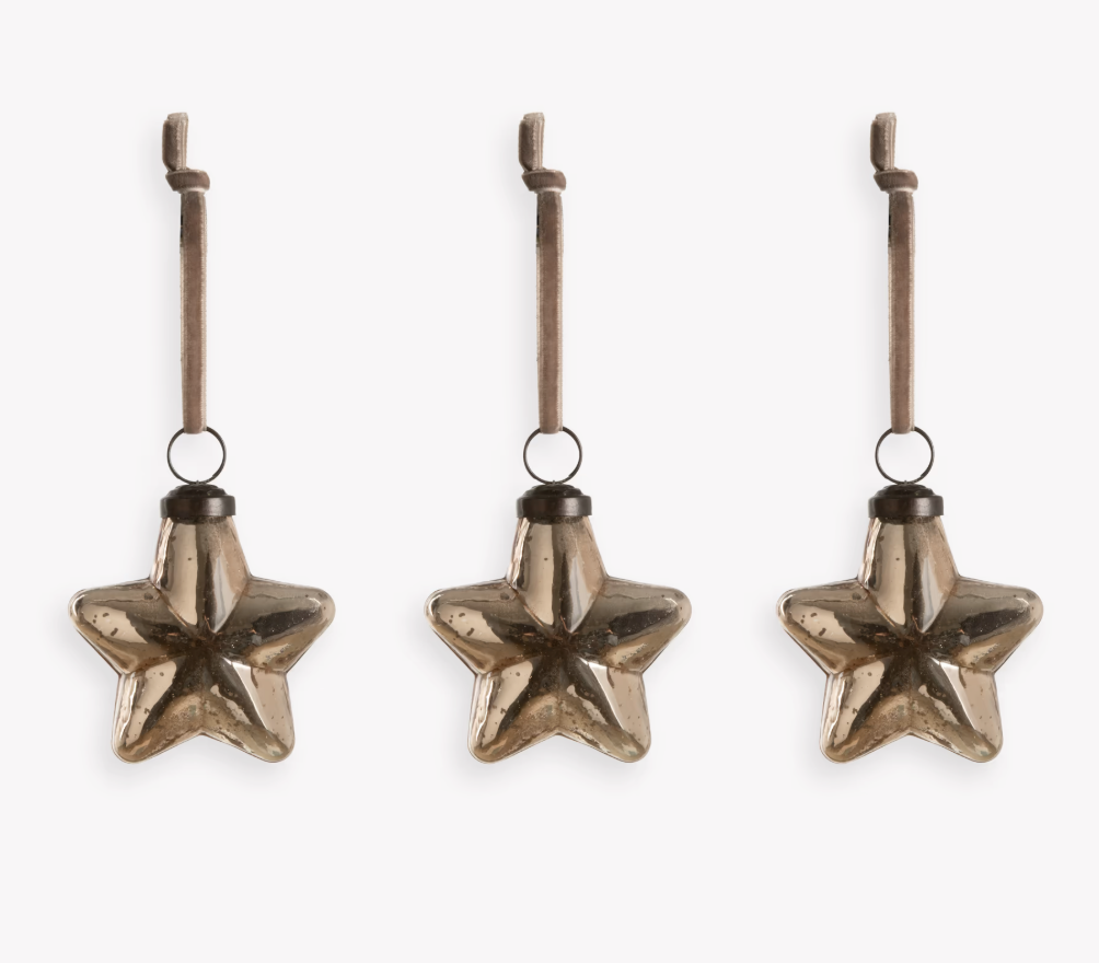 With their mercury silver hue and decadent velvet hanging ribbon, our Luxley Christmas Star Baubles bring instant luxury to the Christmas tree. This set of three is crafted from metal with an antique brown topper, and their shiny metallic finish enhances the effect of your Christmas lights by reflecting their sparkle. Pair with our Lovell Crackled Christmas Heart Baubles for added shine, and with the matching clear glass version.
