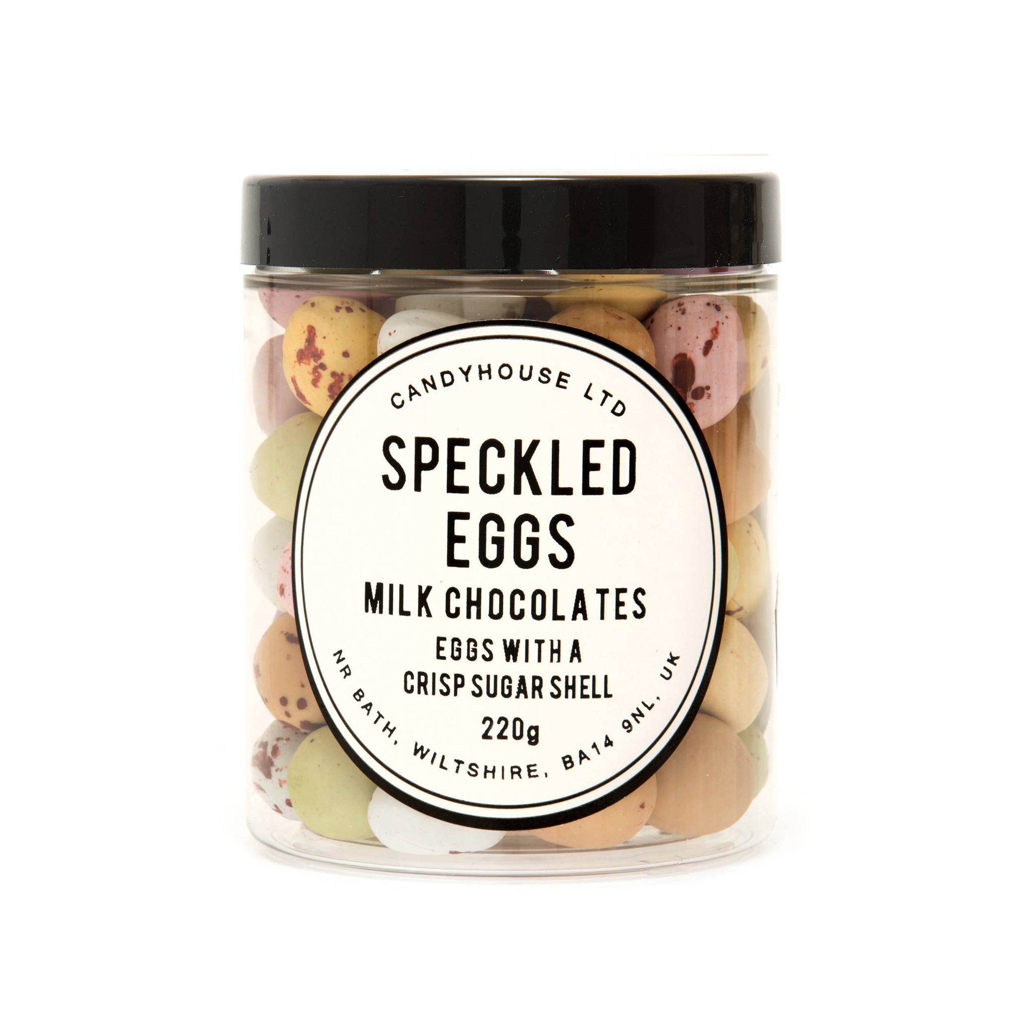 Speckled Milk Chocolate Eggs in a Crisp Sugar Shell (220g). Natural Colours & Flavours. Milk Chocolate Contains 24% Cocoa Solids Minimum, & 20% Milk Solids Minimum. Choose from the black & white Oblong label, or the classic Round Label. Also choose your preferred colour of lid Black, White or Silver (Silver +£0.10p) Illustrated labels are also available on our other listing. Please note: Lid colour may not be correct on image, as we have labels only assigned to descriptions. The price will reflect the lid. May Contain Peanuts & Other Nuts. Store in a cool, dry place, away from direct sunlight.