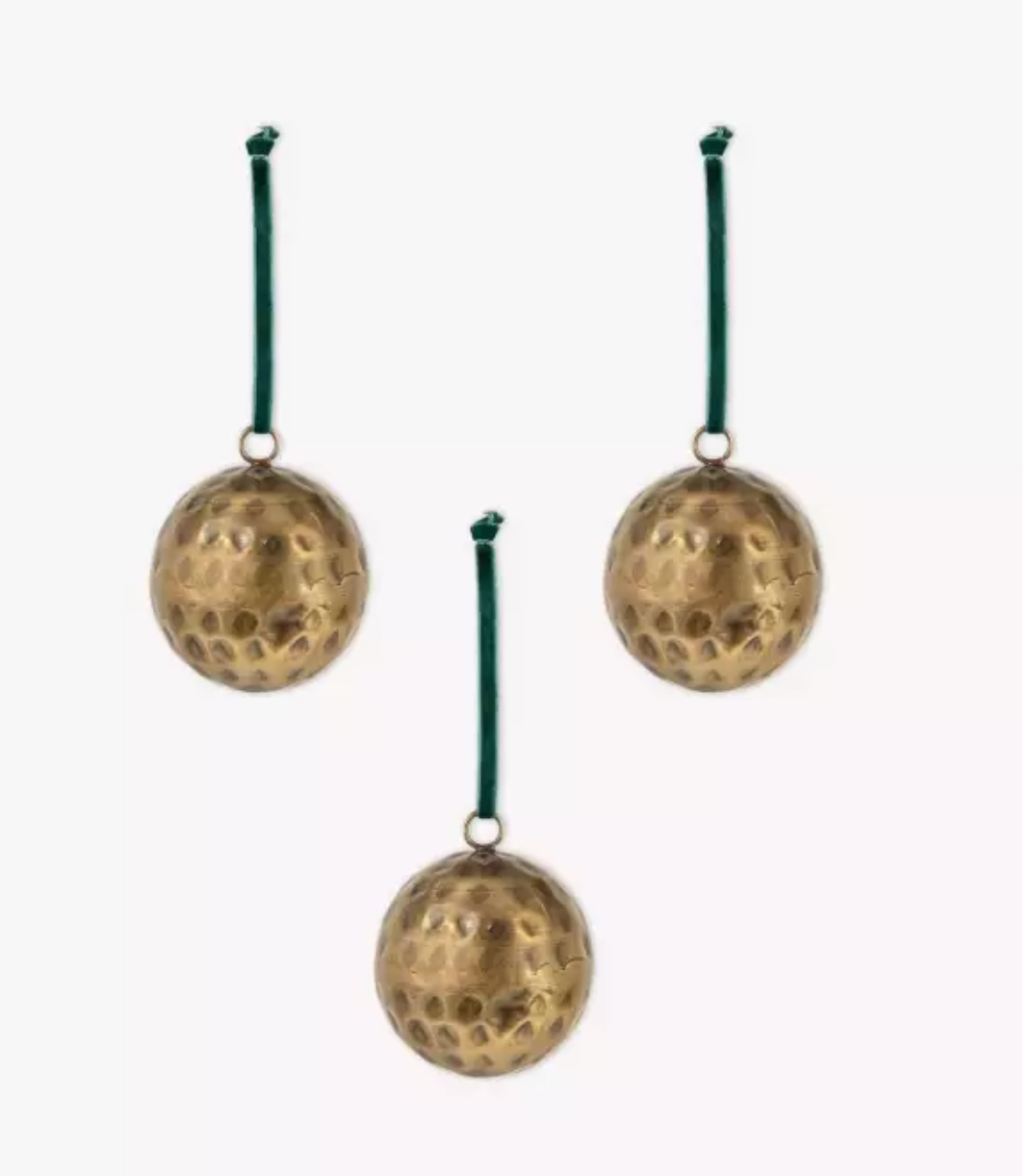 Bring timeless elegance to your tree with the Ardington Hammered Baubles. This set of three metal baubles features a hand-hammered antique brass finish, adding a warm golden glow to a traditional red, green, and gold Christmas palette. Hung on sumptuous dark green velvet ribbons