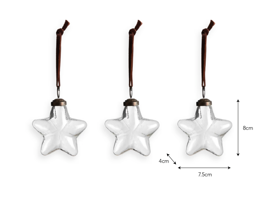 With their mercury silver hue and decadent velvet hanging ribbon, our Luxley Christmas Star Baubles bring instant luxury to the Christmas tree. This set of three is crafted from metal with an antique brown topper, and their shiny metallic finish enhances the effect of your Christmas lights by reflecting their sparkle. Pair with our Lovell Crackled Christmas Heart Baubles for added shine, and with the matching clear glass version.